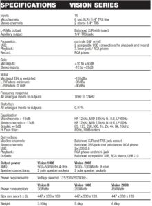 Vision je dostupan u tri formata prilagođena vašim PA zahtjevima. Vision 8 je savršen partner za sve veličine zvučnika sa napajanjem, a Vision 1008 sa svojim dvostrukim unutrašnjim pojačalom od 500 W ima snagu za isporuku na bilo kojem mjestu. Vodeći Vision 2008 ima ukupno 2000 vati solidne snage kada se traži vrhunski kvalitet zvuka. Svi imaju 10 kanalnih ulaza (6 mikrofonskih/linijskih i 2 stereo), dva 2-kanalna USB interfejsa i korisnu funkciju Standby koja isključuje sve ulaze osim stereo reprodukcije u intervalima. Dva DSP procesora efekata studijskog kvaliteta mogu se koristiti nezavisno ili, pritiskom na dugme, povezati se za stvaranje jednog ogromnog efekta reverb/delay za tu dramatičnu moćnu baladu! Svi modeli su slobodno stojeći ili se mogu montirati na stalak (uključen u komplet), osigurana je utičnica nožnog prekidača za utišavanje vanjskih efekata i 48V fantomsko napajanje je dostupno na svim ulazima za mikrofon. Preuzmite kontrolu nad svojim zvukom sa Vision kompaktnim PA mikserima.